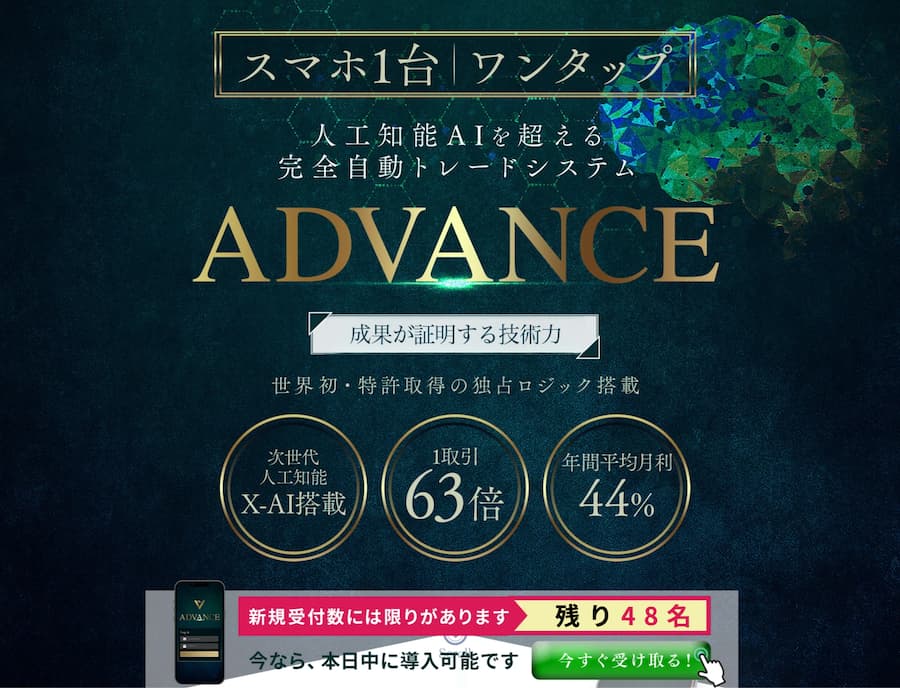 アドバンス(ADVANCE)は、米澤蓮(よねざわれん)が開発したAI搭載の完全自動トレードシステムです。スマホでタップするだけで資産が増える、国から認められた特許や性能で平均月利44%・1取引で63倍を叩き出しているとのこと。