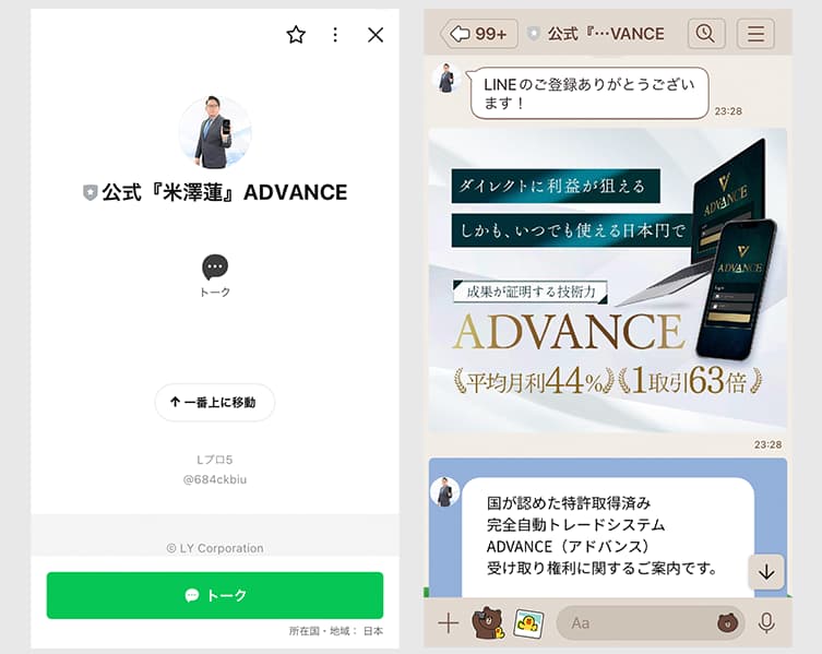 次の画面では、LINEの追加を求められ、「公式 米澤蓮 ADVANCE」というLINEアカウントを友だち追加することで、本登録が完了となり、やりとりが始まる流れのようです。
