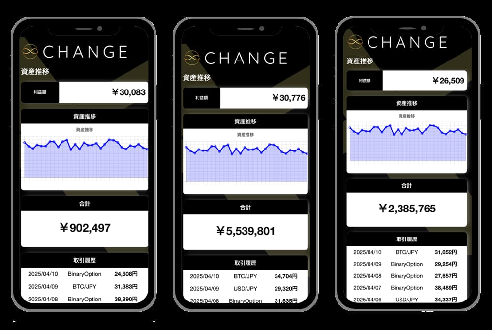 案件ページにあるチェンジ(CHANGE)のトレード画面には、FX・バイナリーオプション・仮想通貨のトレード履歴が書かれているので、複数の金融商品を扱う分散投資のスキームだと考えられますが、