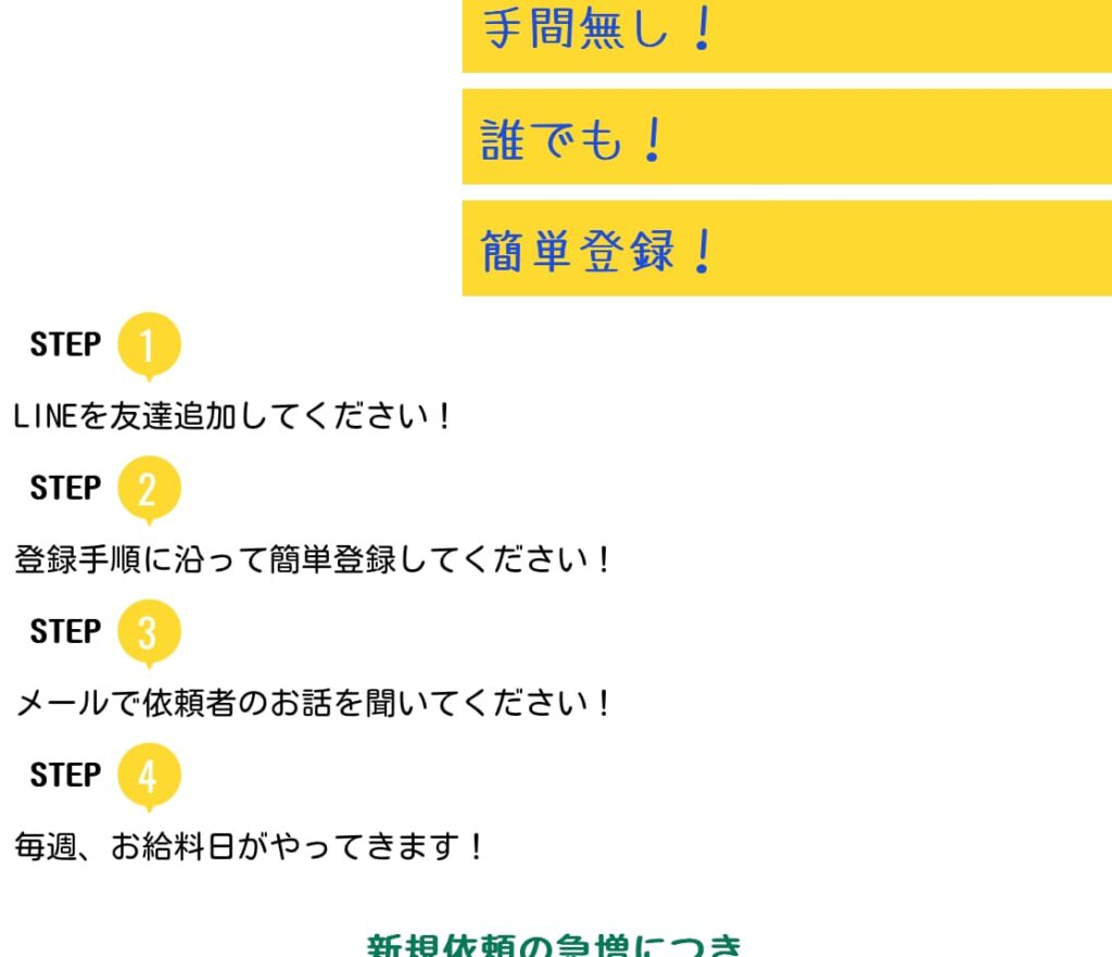 LINE登録からさらに登録手順に沿って登録をして、メールで依頼者の話を聞くという流れで毎週稼げるようになるとのことですが、説明はたったこれだけのようです。