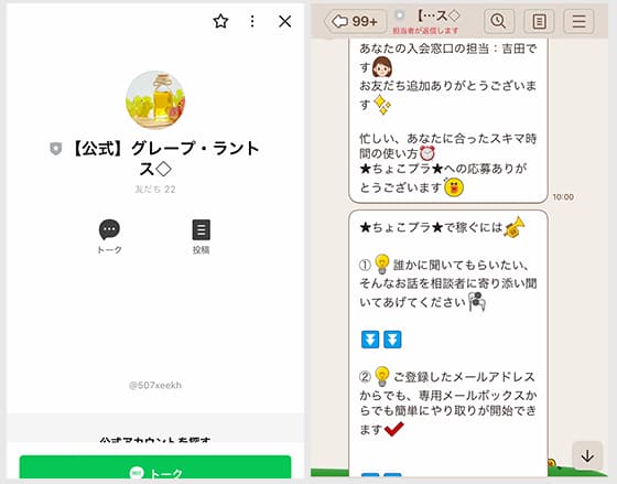 次は紹介先LINE「公式 グレープ・ラントス」というアカウントを追加するよう案内され、