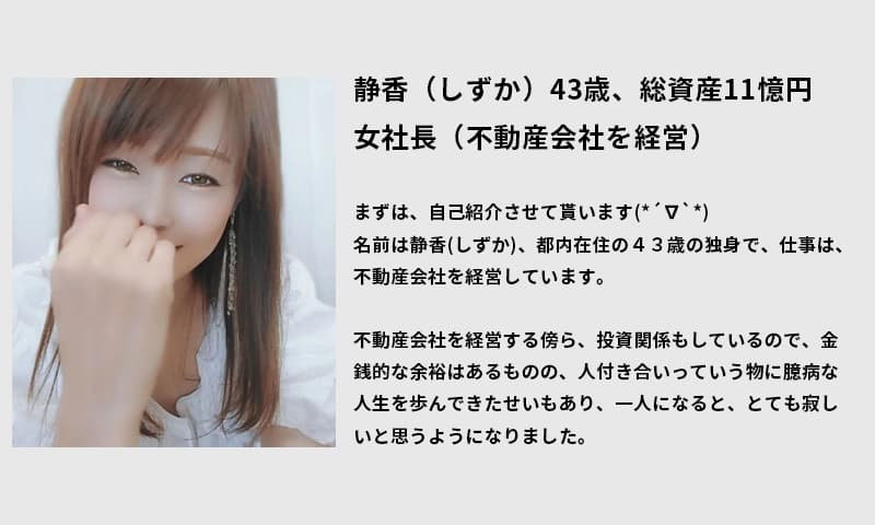 担当者の吉田からは、「セレブ会員様とマッチング済み」と伝えられ、「静香」という女性を紹介されます。