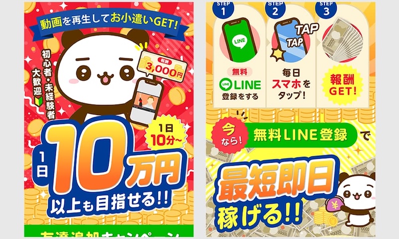 「スマホで動画を再生するだけでお小遣いGET!」「1日10万円・月300万円以上目指せる」などの魅力的なフレーズが並んでいますが、本当にそんなに簡単に稼げるのでしょうか?