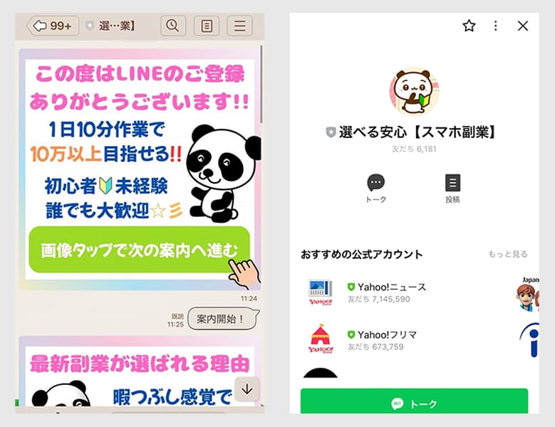 具体的な説明などは一切なく、タップしてやり取りを進めていくと、さらに別のLINEアカウントを案内されたり、