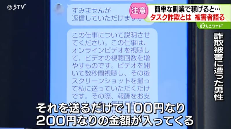 この手口の流れは、まず「動画を視聴し、スクリーンショットを送るだけ」「SNSの投稿にいいねを押すだけ」といった簡単なタスクを提示するところから始まります。