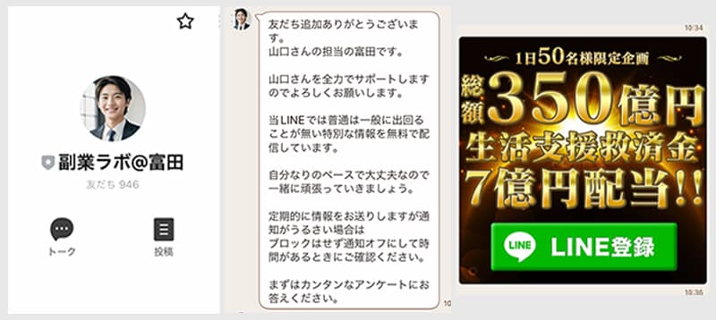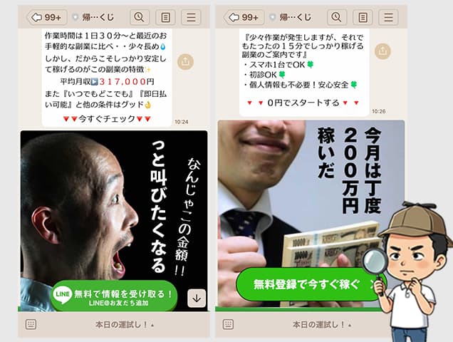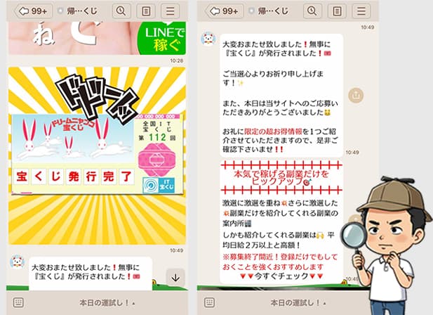 実際に公式LINEからは「宝くじ」とは関係のない、悪質な副業案件が大量に送られてきたり、