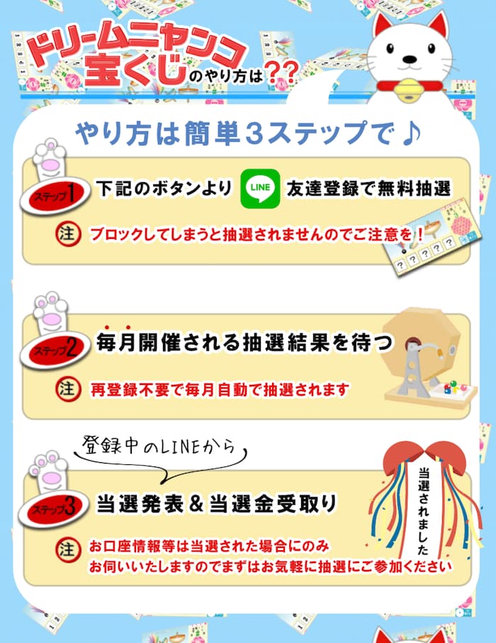 案件ページの「ドリームニャンコ宝くじのやり方」には、毎月当選発表があるようなので一つのLINEアカウントに対して宝くじが1枚配布されるようですね。
