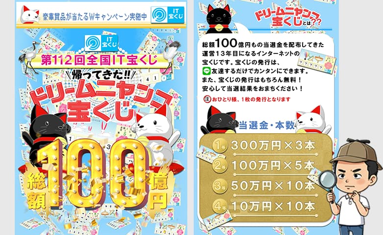 ドリームニャンコ宝くじとは、運営13年目で総額100億円もの当選金を配布してきたインターネットを活用した宝くじサイトであり、今回のオファーは第112回とされています。