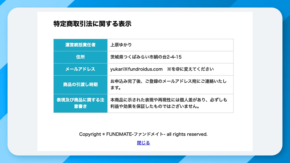 では、実際にファンドメイト(FUNDMATE)の特商法を確認してみると、このように書かれていました。