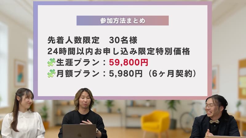 元々は98,000円の料金と返金保証が付いているところから、限定で料金が下がっての5万9,800円ということで入会する敷居は比較的低いですが、