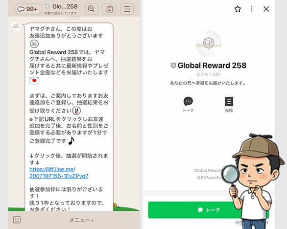 ※ちなみに、検証する日によってLINEの名前が「Global Reward 258」から変わるようなのでご注意ください!