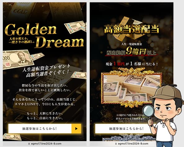 今回は、GMSゴールデンドリームの当選LINEの「配当総額9億円以上!現金が当たるチャンス」という当選詐欺案件について徹底的に調査します。
