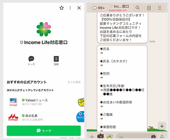 すると、LINEの追加画面に遷移し、「Income Life 対応窓口」という公式アカウントの友達追加を求められます。