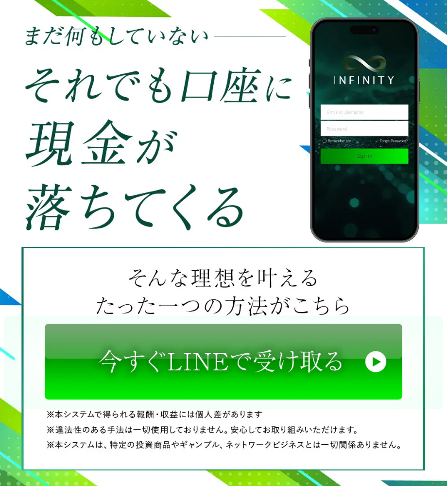 INFINITY(インフィニティ)とは、「スマホ操作だけで誰でも簡単に利益が狙える」といった内容を前面に打ち出している、投資・トレードシステム系の案件です。