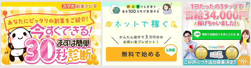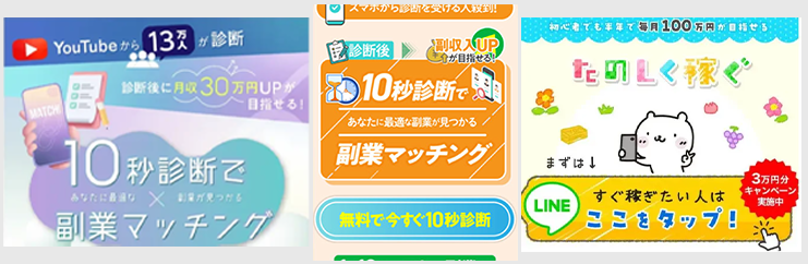いずれも「毎日稼げる副業診断!」や「画像をタップするだけ・動画を見るだけ・写真を撮るだけ」など興味を惹く内容が書かれていますが、