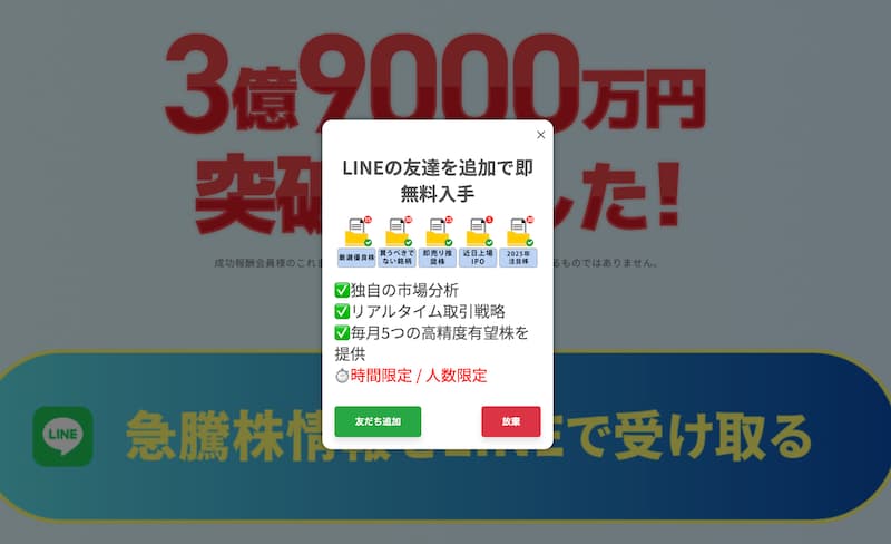 株マイスターの偽装広告ページから、「急騰株情報をLINEで受け取る」をタップしてみるとポップアップ画面が表示されました。