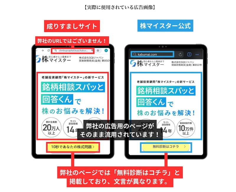 株式会社SQIジャパンとは一切関係のない偽装広告なので注意しましょう!