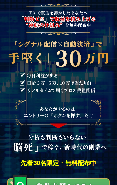 半裁量EA「金獅子」は、どうもおすすめできない案件です。多くの情報が不足していて、詐欺の匂いを感じます。特に、サイト上では「手堅く+30万円」と謳われているにも関わらず、具体的な実績が一切ありません。