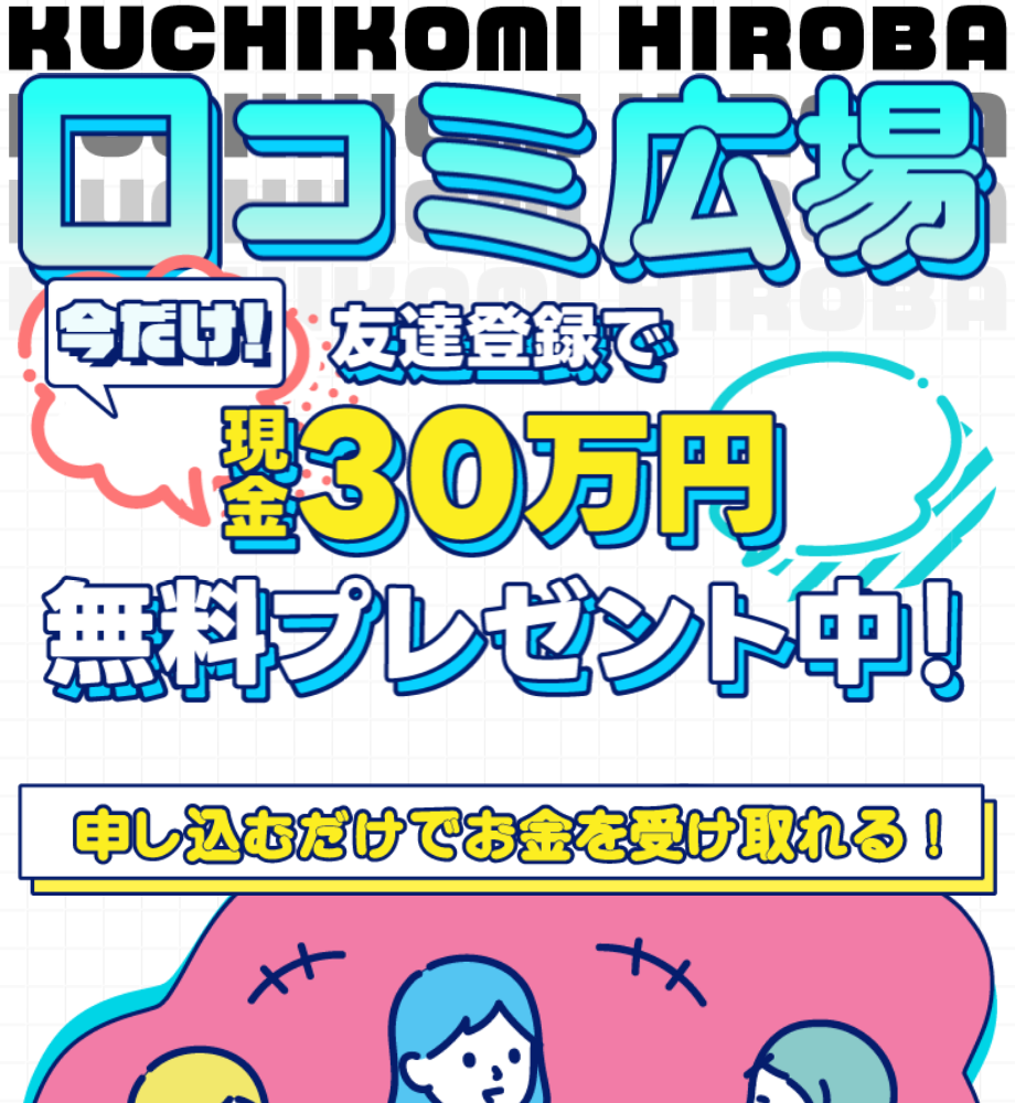 口コミ広場とは、「LINEに登録するだけで現金30万円がもらえる」「助成金・給付金の情報を受け取れる」といった内容を前面に打ち出した、副業系の案件です。
