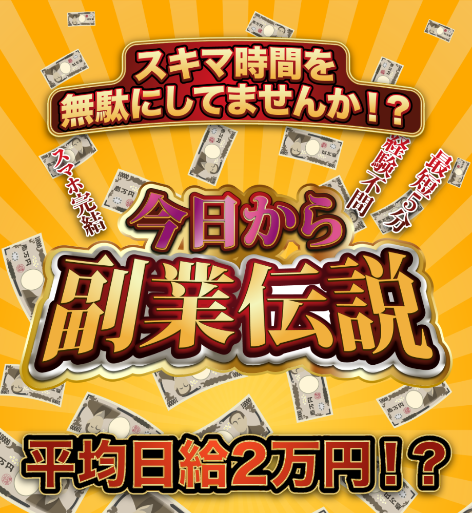 今回は、「今日から副業伝説」の「1日5分でスマホだけで稼げる!」というスマホ副業案件について徹底的に調査します。