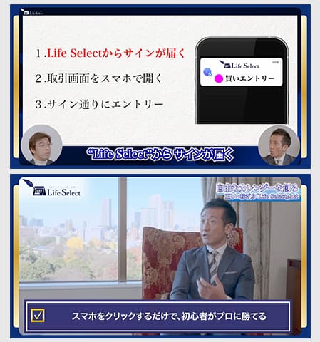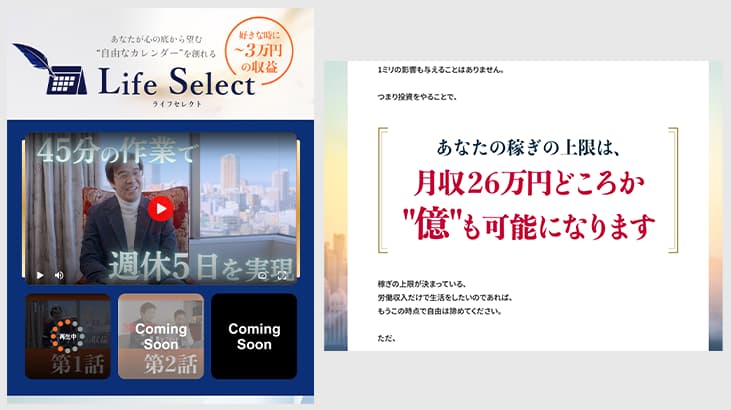 LifeSelect(ライフセレクト)とは、世界No.1トレーダーが開発した時短トレード術を提供する投資プロジェクト。誰でも簡単に1日45分ほどの作業をすれば、投資の知識・経験・能力・年齢に関係なく1日3万円稼げると謳っています。