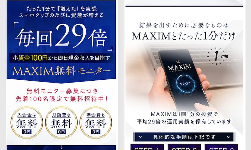 - 「MAXIMは1回1分の投資で平均29.7倍の運用実績」