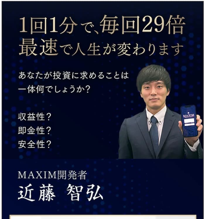 MAXIM(マキシム)は、近藤智弘が開発したトレードシステムです。最新AIによって完全自動で稼ぐ仕組みによってスマホ2タップ・たった1分の簡単作業で、資金を平均29倍に増やせる運用実績があるとのこと。