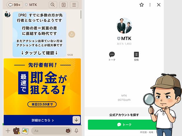すると、すぐに「MTK」というLINEアカウントの追加画面に遷移し、友だち登録を完了させると自動的にPRメッセージが届きました。