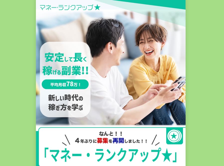 マネーランクアップとは、「スマホがあれば1日たった20分の作業だけでセレブの仲間入り」になることができ、平均月収が78万円の安定して長く稼げる副業だと謳われている副業案件です。
