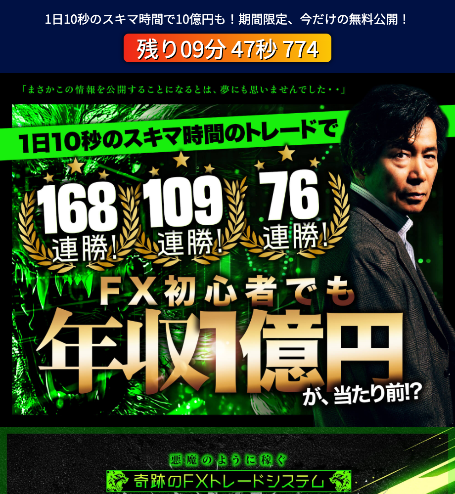 「1日10秒のスキマ時間で1億円」「勝率100%」「109連勝・168連勝の奇跡のEA」