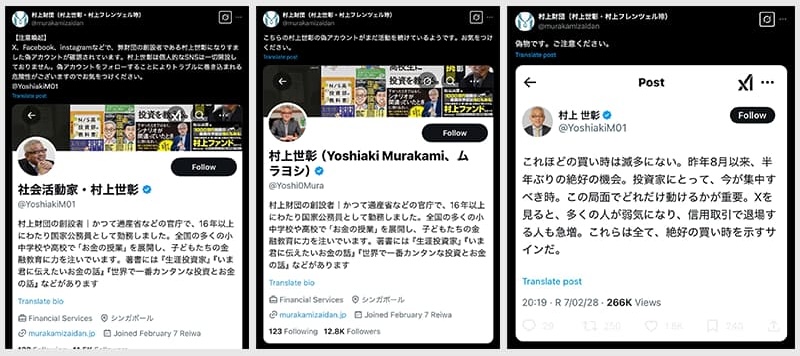 村上世彰の偽アカウントが絶えず出てくるようで、繰り返し公式からの注意喚起が行われています。
