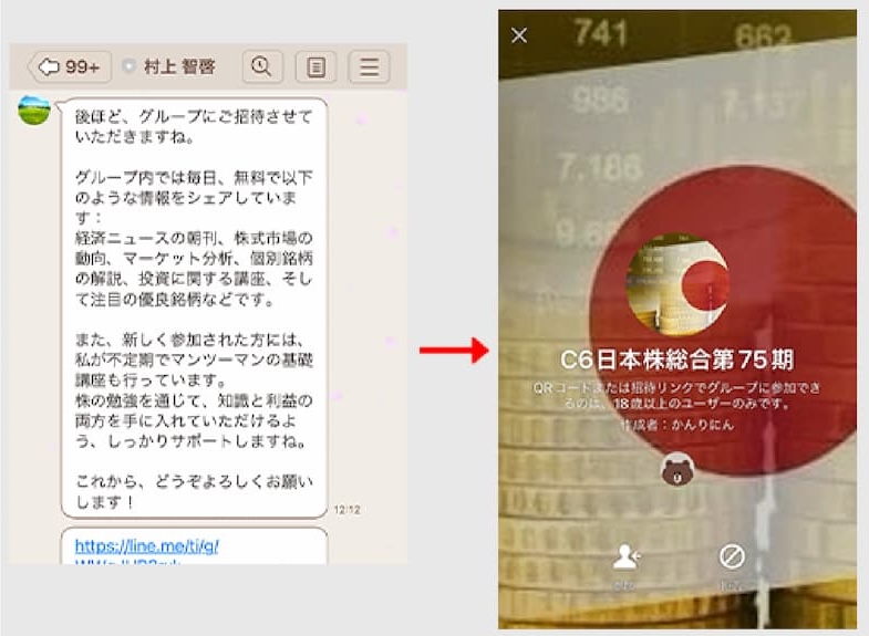 まず、村上世彰や担当者を名乗るLINEアカウントから「限定の学習グループ」と称して、LINEグループチャットへの参加を勧めてきます。