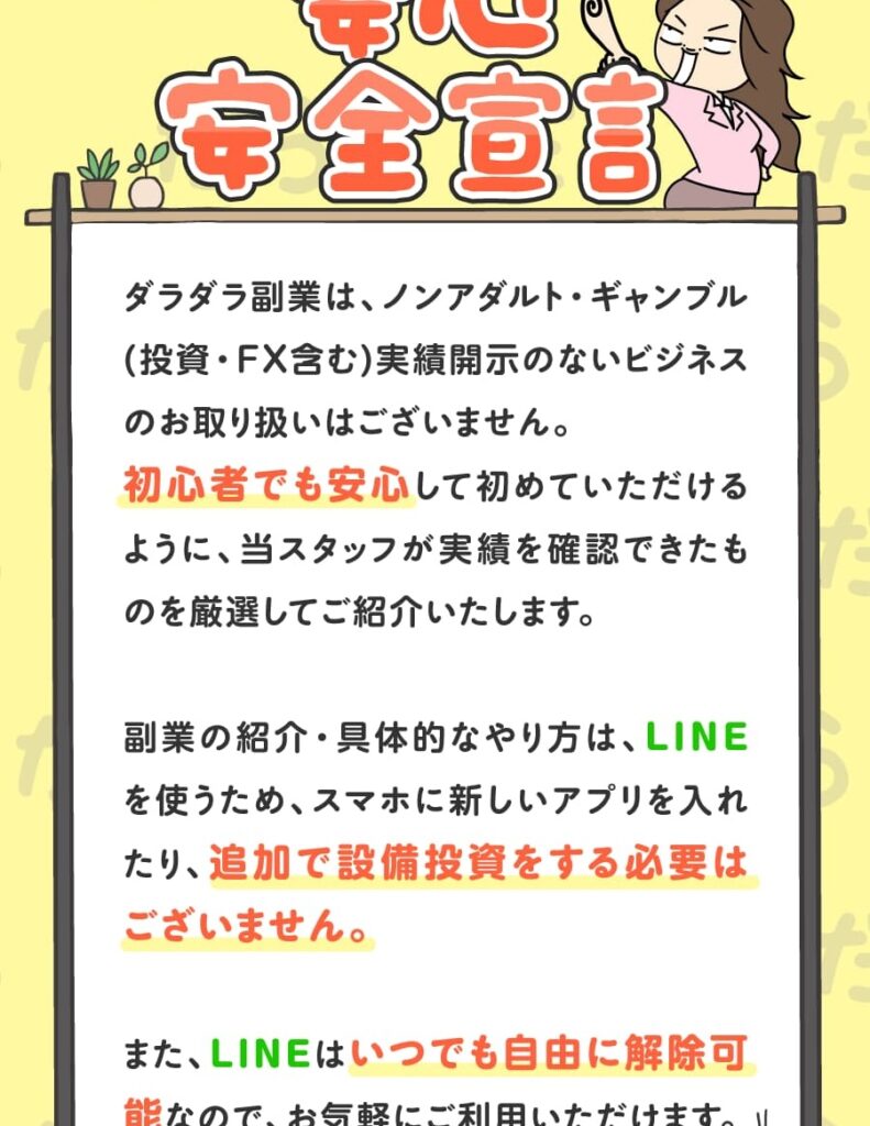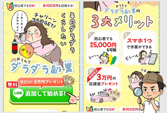 この場合、誇大広告による宣伝、LINEでの囲い込みの疑いもあるため、お家でダラダラ副業に近づくのは危険です!