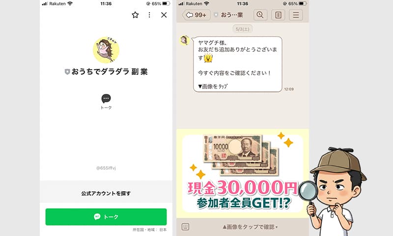 LINEから「現金30,000円を参加者全員がGETできる」のバナーを押すたびに、