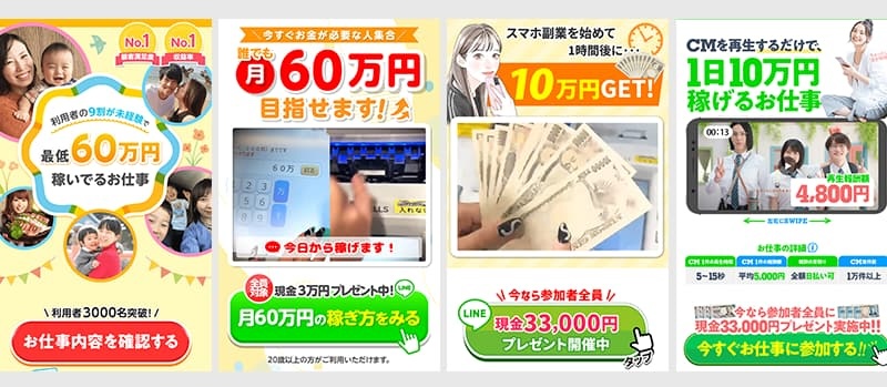 「今すぐCMを見るだけで10万円」「たった5分で大金が受け取れる」などの甘い言葉が並んでいる副業案件の案件ページに飛びました。