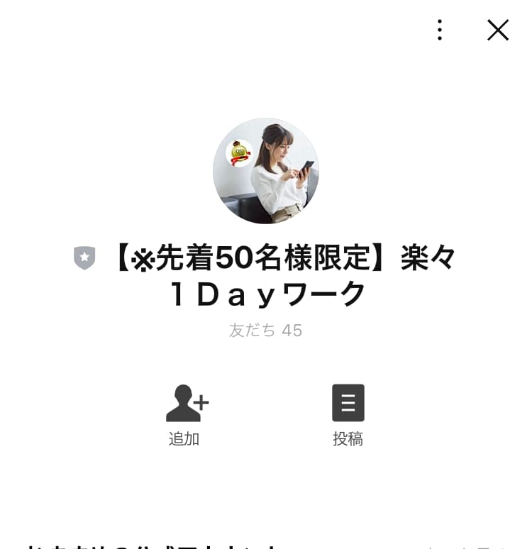 まず、案件ページの登録ボタンを押すと、「先着50名様限定 楽々1Dayワーク」というLINEアカウントを追加するよう求められます。
