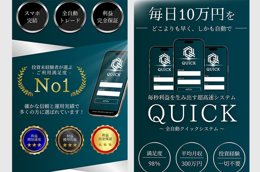 全自動QUICKシステムは、「完全自動で月収300万円を実現」「超高速で利益が膨らむ」と謳われた投資のトレードシステムです。