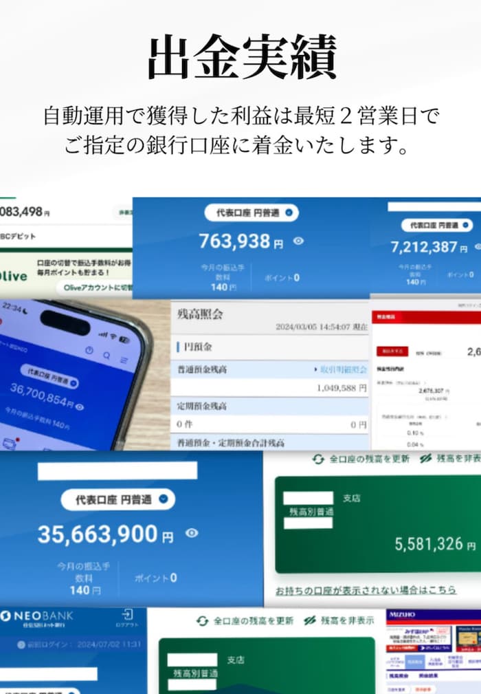 すでに成功者の声も掲載されており実績が出ているようですが、具体的な取引履歴や証拠画像がなく、口座残高だけを見せているのも気になりますね。