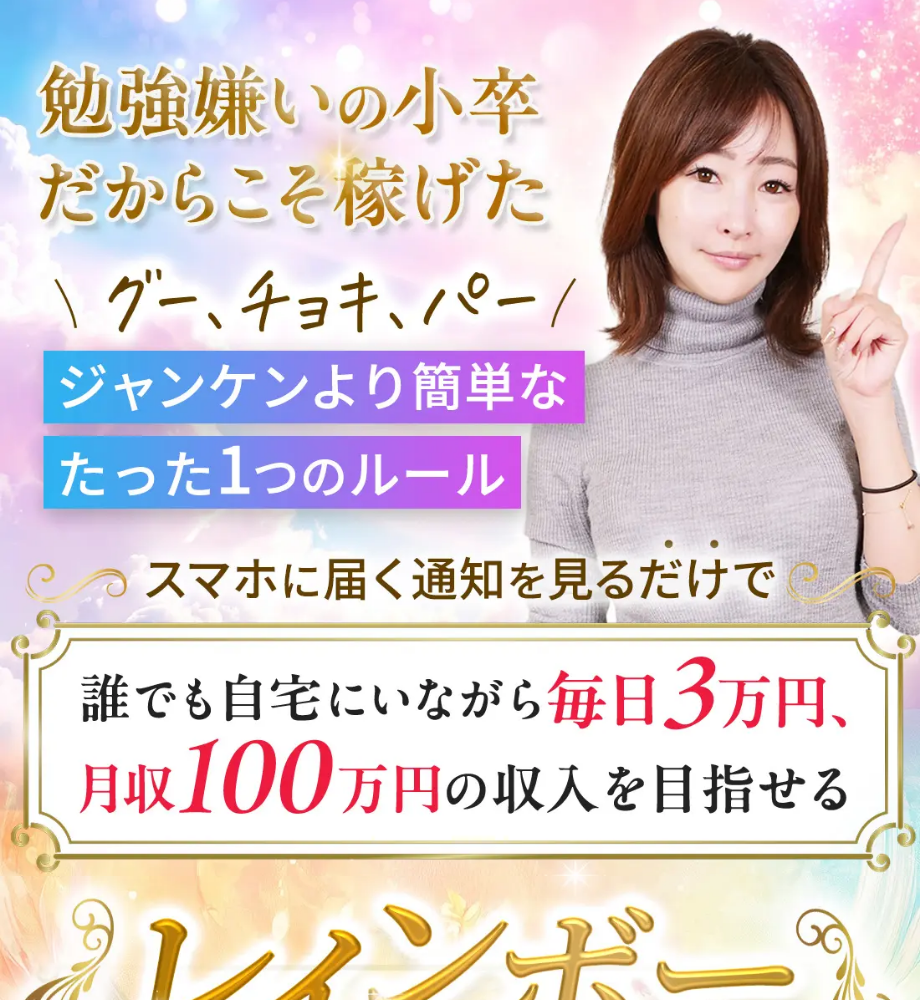 競合記事や登録検証の流れを見る限り、レインボープロジェクトは無料動画で期待感を高め、最終的に有料の投資サロン(レインボーサロン)へ誘導するビジネスモデルだと考えられます。