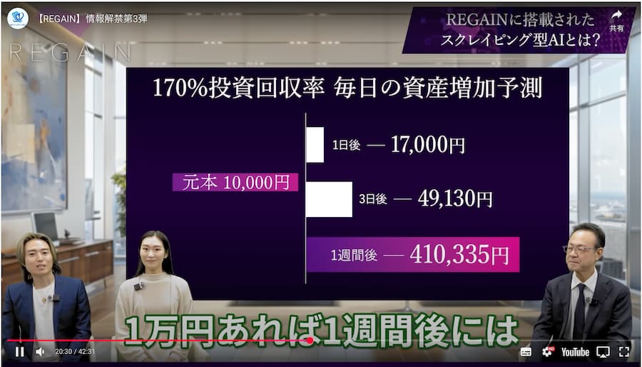 - 第1話〜第3話の動画を順に視聴し、その後「REGAIN FOUNDATION PLACE」の案内が送られる。