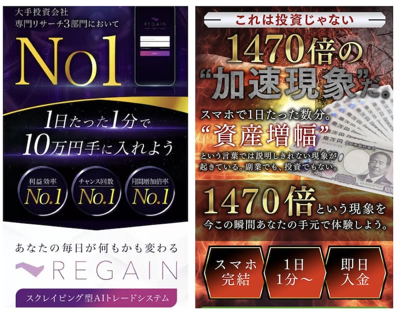 REGAIN(リゲイン)の広告では「競輪を活用した自動売買システム」「安定した配当報酬」といった魅力的な文言が並んでいますが、実際にはギャンブル性が高く、持続的に利益を得るのは困難な可能性があります。