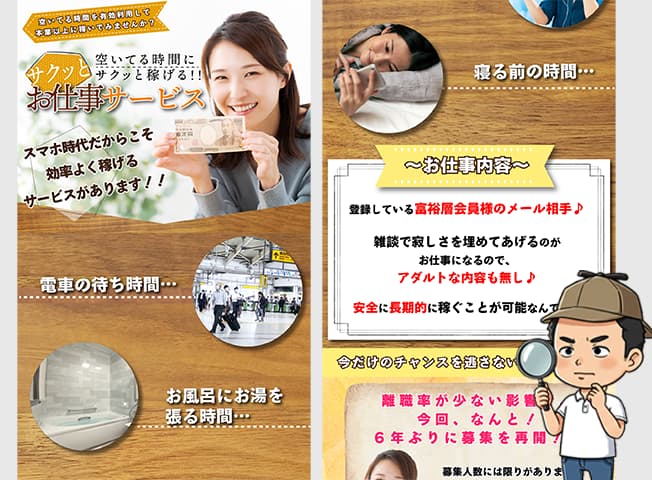 仕事内容は、案件ページによると「富裕層会員様のメール相手になって、雑談で寂しさを埋めてあげるのがお仕事」とのことで、メールレディ・チャットレディの類の副業とのことです。