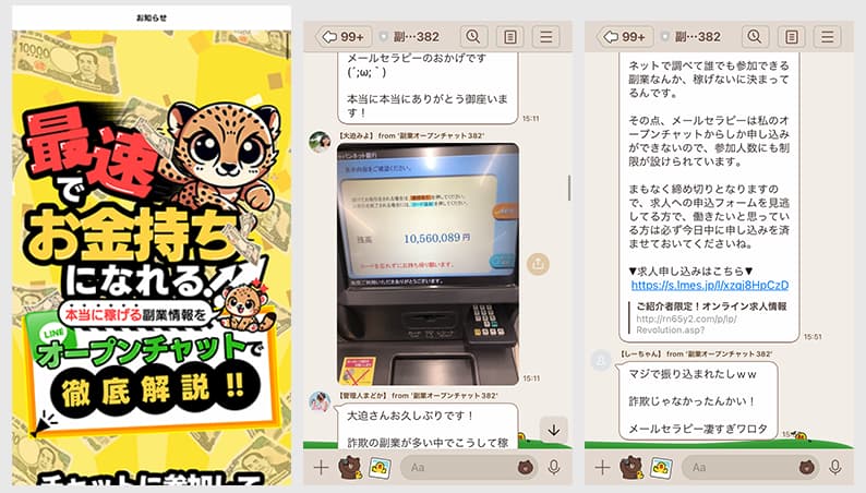 「簡単に稼げる!こんなに儲かった!」などのやりとりをするサクラ業者アカウントが紛れています。