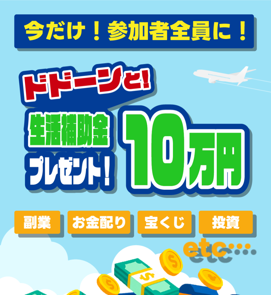 「今すぐお金を手にしたい方限定!収入ステーションのLINE登録で10万円の生活補助金をプレゼント!」