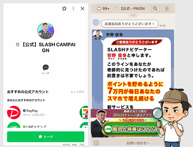 すると、「公式 SLASH CAMPAIGN」というLINEアカウントへの追加が促され、