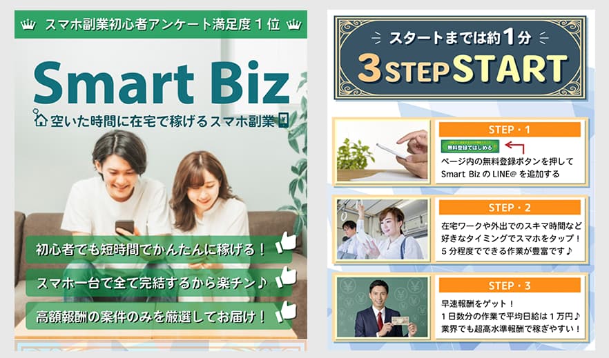 SmartBiz(スマートビズ)とは、無料登録して公式LINEから情報が届くたびにスマホをタップする作業をするだけで「誰でも簡単に高収入が得られる」と謳う副業案件です。