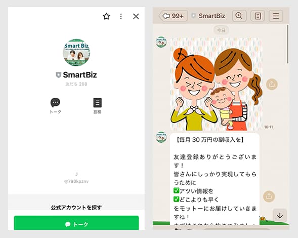 すると、すぐに公式LINEアカウント「SmartBiz」が表示され、そのまま追加する流れになります。