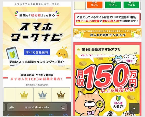 また、どの案件も似たようなデザインや案内が目立っており、すべてスマホワークナビの運営が行っているとも考えられます。