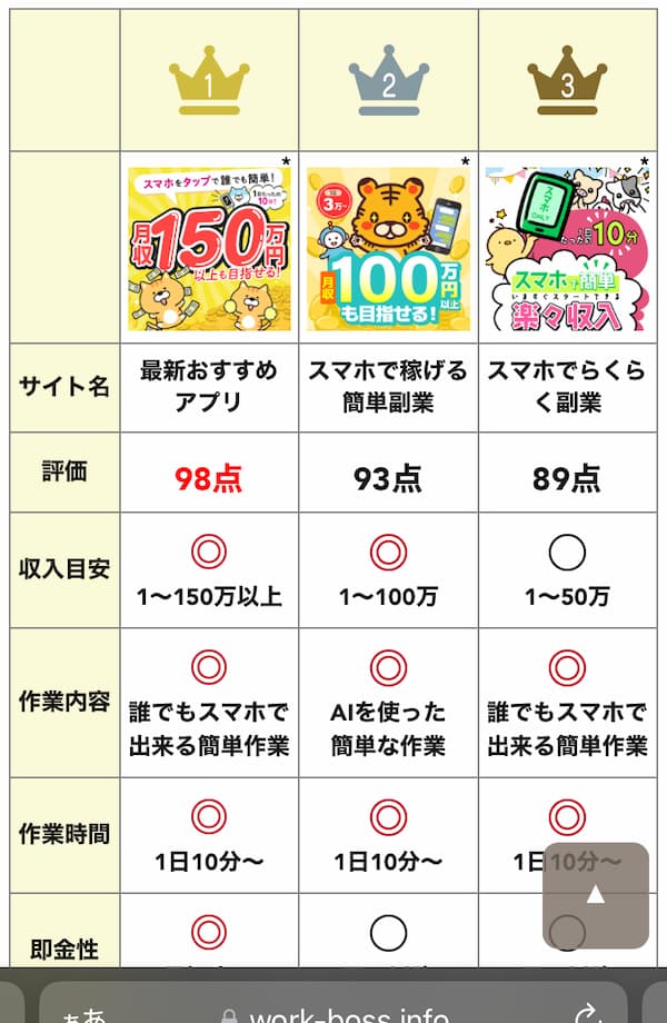 収入目安は1万円〜150万円など高く、作業内容も1日10分ほどで完了するスマホ作業が並んでいます。