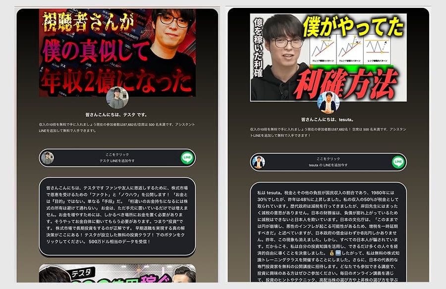 しかし、その内容を詳しく調べたところ、テスタ本人とは一切関係のない詐欺広告である可能性が高いことが判明しました。